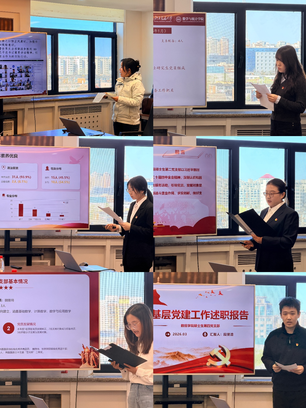 会上,刘玉婷对本次述职情况进行全面总结。她肯定了各支部在党建工作中付出的努力和取得的阶段性成效,尤其对部分支部将学科特色与党建工作融合的尝试予以认可,同时指出,各支部普遍存在党建与科研、业务、学习融合深度不足、学科特色在党建活动中凸显不够等共性问题。她强调,各支部要以问题为导向,持续深化党建与专业融合,深度挖掘数学、统计学专业特色,推动党建工作与科研实践同频共振;要着力营造比学赶超氛围,依托支部集体环境将党员在科研成果、论文发表、学科竞赛中的先锋模范作用转化为支部优良传统;支部委员要进一步强化责任担当,以精益求精的态度将支部工作做细做实。