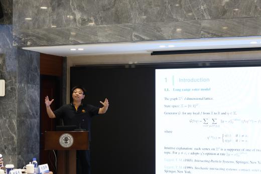 实验室主任于永光教授汇报了实验室的工作进展与未来规划,重点介绍了拓扑网络、生物统计、统计优化、健康大数据分析、传染病动力学、贝叶斯计算等六个方向的代表性成果。随后,实验室青年骨干分别作学术报告:薛晓峰汇报了长程选举模型的占位时的中心极限定理;倪旭敏介绍了基于全基因组数据的复杂人群演化历史建模与推断研究;梁熠宇阐述了随机分形上的结构蕴含问题,并定量说明具有傅里叶维数的分形蕴含更丰富的结构;张瑞丽展示了保结构算法以及保结构神经网络方面的最新进展。