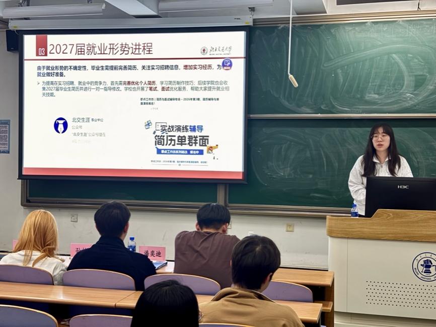 会上,陈斯阳老师结合详实数据,系统复盘2025届、2026届毕业生就业整体情况,清晰解读数学与统计学科相关就业去向,帮助 2027届毕业生精准认知就业前景。随后,陈老师围绕简历优化方法、实习岗位获取渠道等关键内容展开指导,鼓励同学们抢抓时间、提前规划、充分筹备。他提醒大家密切关注校院发布的就业资讯,主动对接市场需求;公司也将立足专业特色,持续开展简历一对一修改、专项求职辅导等精准化就业服务,全方位助力同学们提升求职竞争力。